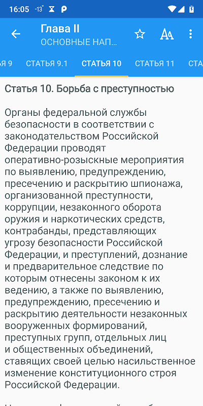 - Просмотр текста закона в виде удобного перелистывания статей, возможностью копирования выделенного фрагмента, поиска по тексту