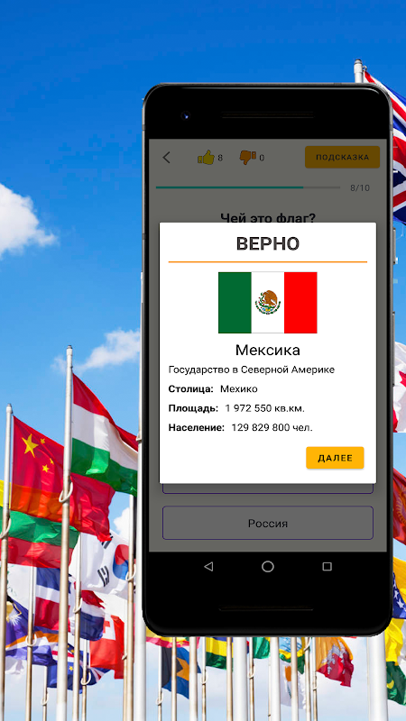 더 보기 Викторина по флагам мира содержит 9 уровней от простого к сложному.