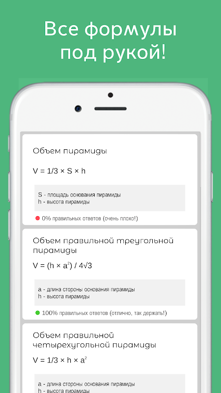 안녕 내 친애하는 친구! 모든 것이 매우 간단합니다. 절대적으로 모든 기하학 공식은 16개의 섹션으로 나뉘고, 필요한 것을 선택하고, 공식을 연구하고, 섹션 전체에 걸쳐 짧은 최종 테스트를 통과하세요!