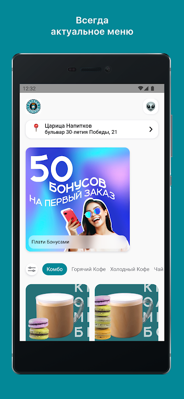 신선한 음식과 정말 맛있는 음료. 애플리케이션 '퀸'을 통해