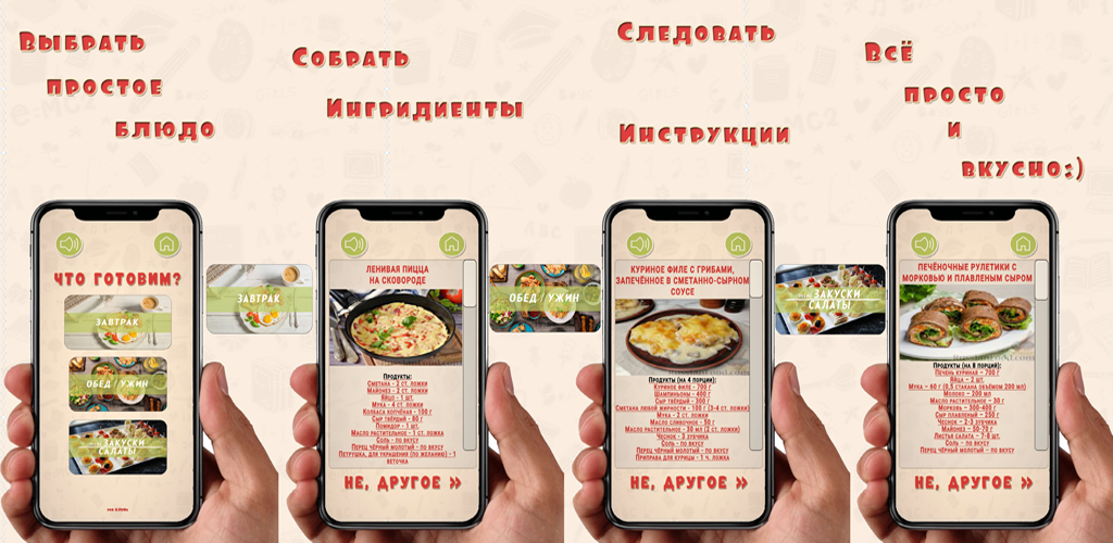 "아침 식사", "점심 또는 저녁 식사", "간식 또는 샐러드" 등 무엇인지 선택하기만 하면 됩니다. 그 후에 응용 프로그램은 집에서 요리를 준비하기 위한 사진과 자세한 지침이 포함된 간단한 요리법을 선택합니다.