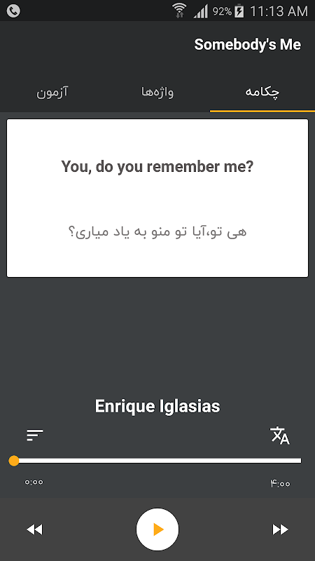 شما می توانید در این نرم افزار کاملا کاربردی همزمان با شنیدن موسیقی و مکالمات چکامه از متن اصلی و ترجمه آن به طور لحظه به لحظه بهره مند شوید تا همزمان هم قدرت شنیداری خود را تقویت کنید و تلفظ لغات و املای آن ها و هم ساختار جملات و کلمات ترکیبی را با لذت بخش ترین روش و مجموعه ای از بهترین مکالمات و موسیقی های جهان فرابگیرید.