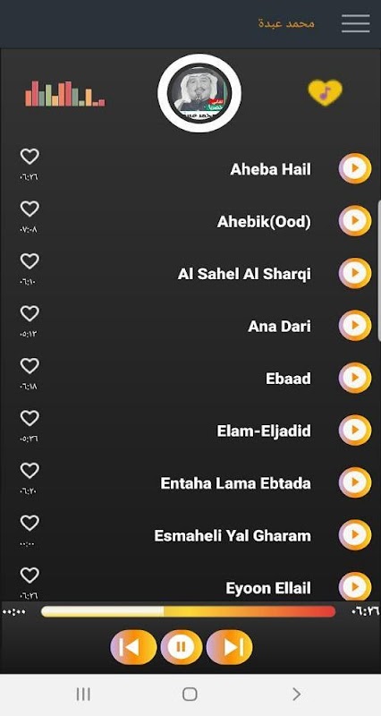 # 아티스트 Mohamed Abda의 가장 멋진 노래의 꽃다발을 추가한 인터넷 없이도 작동하는 노래 플레이어 응용 프로그램을 제공합니다.