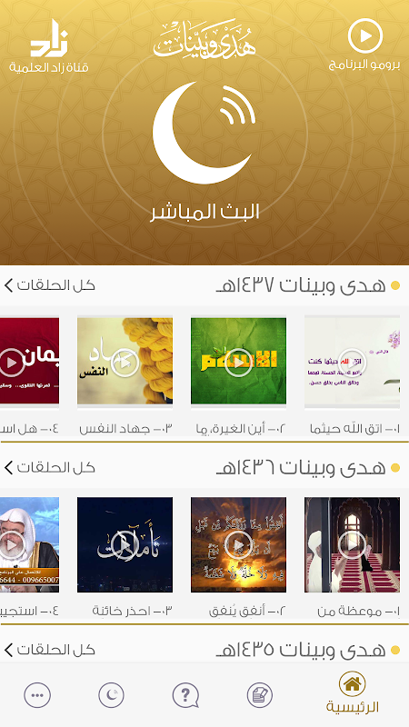 تطبيق (هدى وبينات): تطبيق رمضاني يمكن للمستخدم من خلاله أن يتابع حلقات برنامج (هدى وبينات) في شهر رمضان، وذلك عن طريق البث الحي للبرنامج، أو عن طريق مشاهدة الحلقات الفائتة ، كما يمكن متابعة حلقات المواسم السابقة ، ويتيح التطبيق مشاهدة قناة زاد العلمية عن طريق البث المباشر لها...