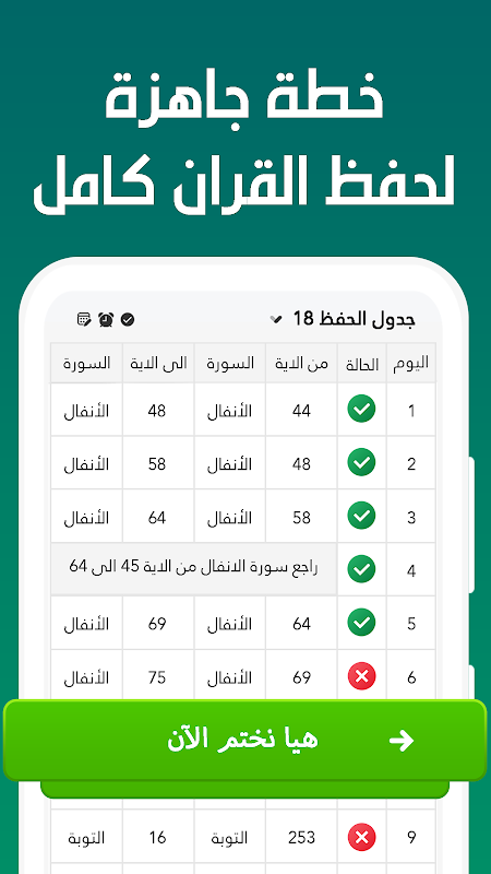꾸란을 암기하는 여정은 꾸란을 완성하는 사용자의 개인적인 경험을 반영하며, 꾸란에 가득 찬 마음으로 헌신을 유지하기 위해 암기하려는 의도를 새롭게 해야 합니다. 이 응용 프로그램은 또한 꾸란 암기 도전을 통해 새로운 목표 달성을 장려합니다.