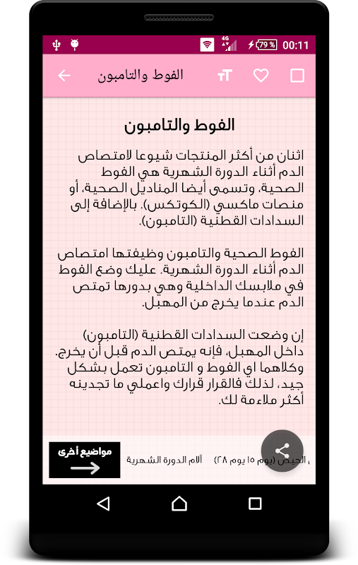 تطبيق جسد المرأة - بدون أنترنت يحتوي على الكثير من المقالات الرائعة والتي تهم المرأة والرجل , يمكن ارسالها عبر وسائل التواصل الاجتماعي ويوجد في هذا التطبيق مجموعة من المقالات المفيدة للنساء، في مجالات متعددة كالثديين و والمهبل و الأعضاء الداخلية و الخارجية و مقالات تخص الدورة الشهرية و و الحيض و الكثير من المواضيع التي تستحق قرائتها، أتمنى أن ينال هذا التطبيق إعجابكم