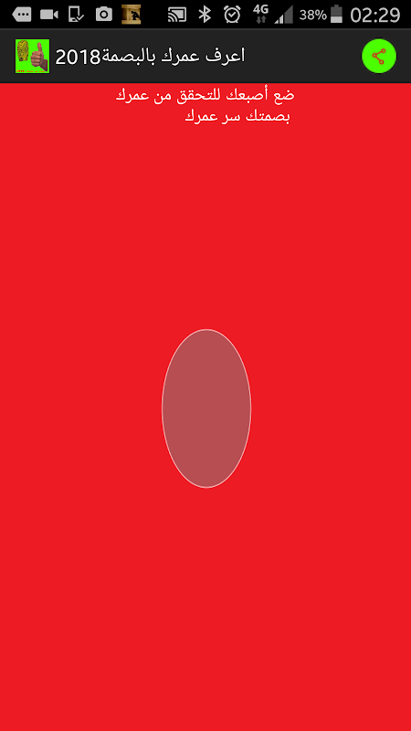 حساب العمر بالبصمة هو تطبيق جميل للتسلية و الترفيه يعطيك عمر اعتباطي بمجرد وضع بصمة إبهامك على الشاشة.استمتع بحساب العمر.