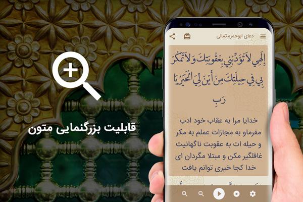 دعای ابوحمزه ثمالی صوتی. با ظاهری مدرن، بدون نیاز به اینترنت با اسکرول (پیمایش) خودکار و همراه با تم شب.