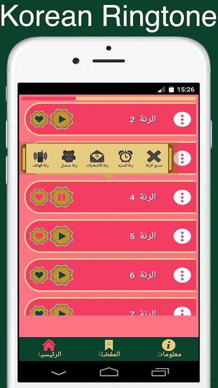 التصنيفات داخل التطبيق:رنات كورية للجوال،نغمات و دبكات عراقية،شيلات سعودية،احدث الرنات الكورية و العربية للموبايل