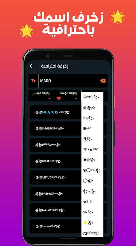 전문적으로 꾸며진 이름을 적용하고, 원하는 모든 장식을 위한 종합 응용 프로그램으로, 인터넷 없이 아랍어와 영어로 글씨를 꾸미고, 아랍어 이름을 꾸미고, 영어 이름을 꾸미고, 이름과 텍스트를 꾸미고 형성할 수 있습니다.