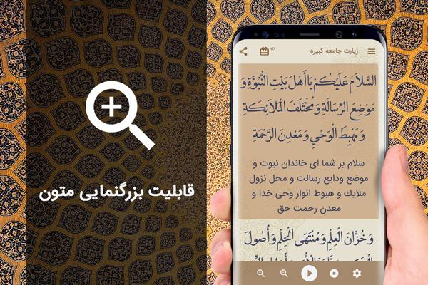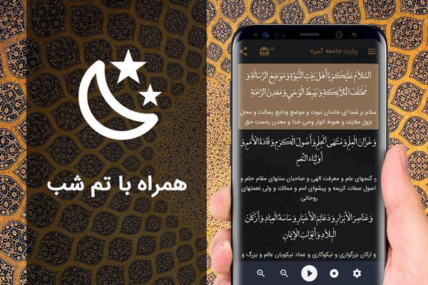 زیارت جامعه کبیره صوتی با صدای سماواتی. با ظاهری مدرن، بدون نیاز به اینترنت با اسکرول ( پیمایش ) خودکار و همراه با تم شب. به زیارتنامهای که ویژه زیارت امام خاصی نیست، «زیارت جامعه» میگویند و از آنجا که این زیارت متنی مفصلتر از بقیه زیارتنامهها دارد به «زیارت جامعه کبیره» معروف شده است. متن زیارت جامعه کبیره به گونهای است که میتوان آن را هنگام زیارت هر یک از امامان(ع) از دور یا نزدیک قرائت کرد.