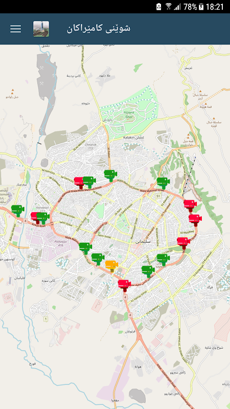 شوێنی کامێراکانی سلێمانی. هەموو کامێرە جێگۆرەکان دیاری کراون لەسەر خەریتە (ئەو کامێرانەی کەوا سابت نین). هەرکامێرایەك کەوا گونمانی ئیشکردن لەسەرە ئەوە دەتوانن ریپۆرتی بکەنو خەڵکی کەی لێئاگادار کەنەوە.