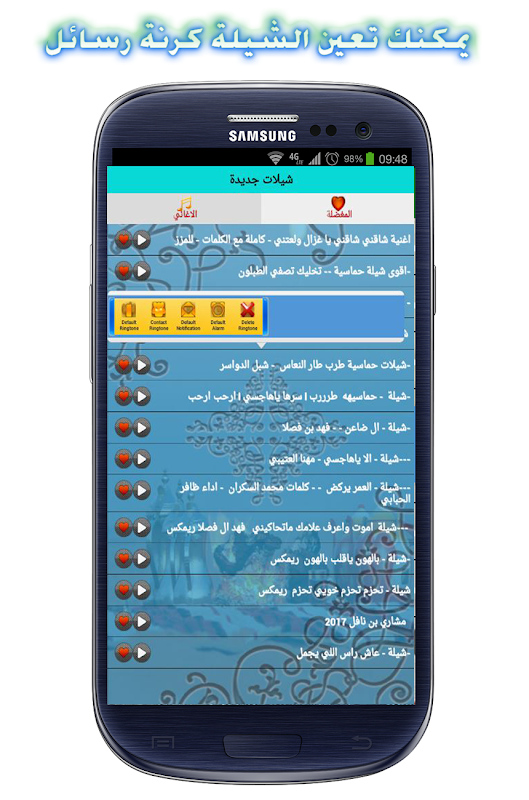 تطبيق يزخر باروع الشيلات الحماسية والمتنوعة وشيلات الطريق وشيلات العذب وشيلات الصحراء يمكنك تطبيق شيلات جديده بدون نت من تعين الشيلة كرنة رسائل او رنة الهاتف ويعمل في الخلفية من بين الشيلات الموجودة في تطبيق