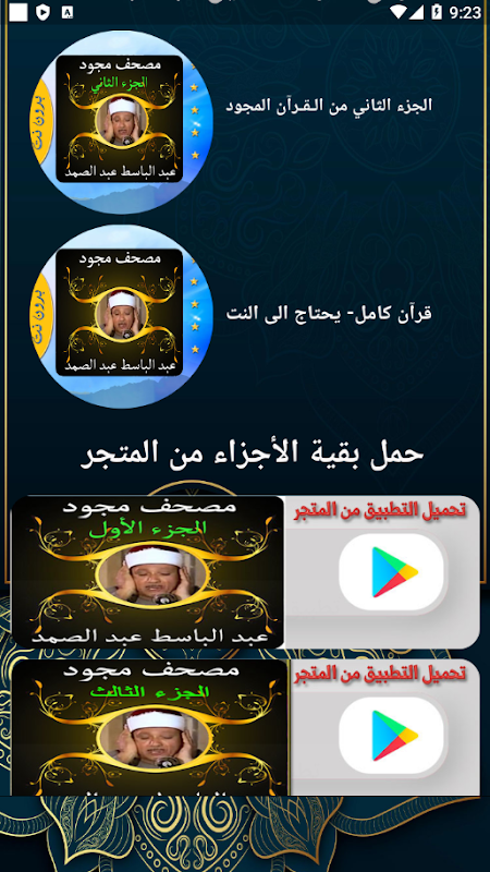 셰이크 압둘 바싯 압둘 사마드가 개발한 무자와드 꾸란 앱 2부를 통해 인터넷 연결 없이도 고품질의 무자와드 꾸란 낭송을 경건하게 들을 수 있습니다.