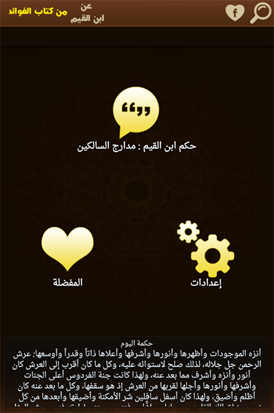 يمكنك من خلال التطبيق مشاركة حكم ابن القيم مع اصدقائك وعلى الفايسبوك