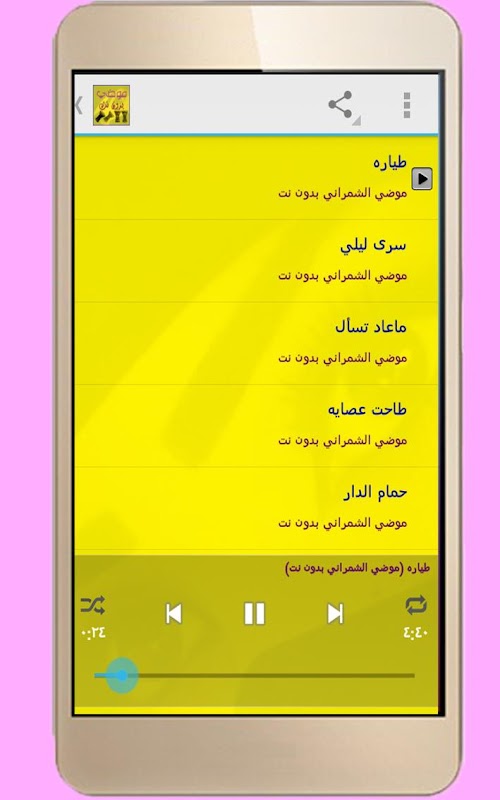 تطبيق ( موضي بدون نت ) هو عبارة عن مجموعة من الأغاني الطربية لفنانة الطرب موضي الشمراني بصيغة MP3