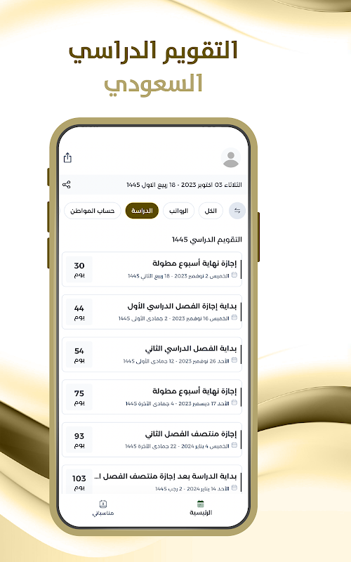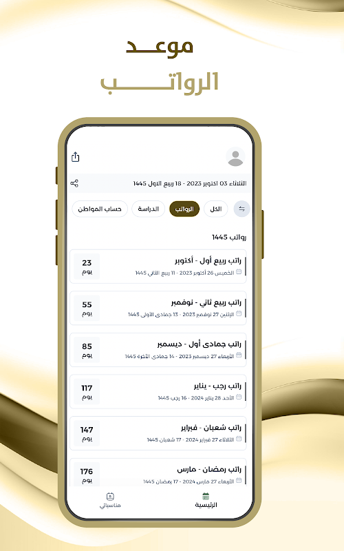 퇴직 급여 애플리케이션은 그레고리력 날짜(각 그레고리력 월의 25일)와 회교식 날짜에 해당하는 날짜에 따라 사우디아라비아에서 퇴직자에게 급여를 지급하는 날짜를 알려줍니다.