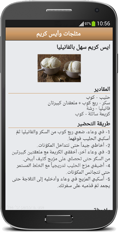 تطبيق وصفات مثلجات و ايس كريم منزلية هو تطبيق مجاني وعربي يحتوي على الكثير من وصفات المثلجات و طريقة عمل الايس كريم في البيت بطريقة سهلة وسريعة لجميع الفصول و الاعمار.