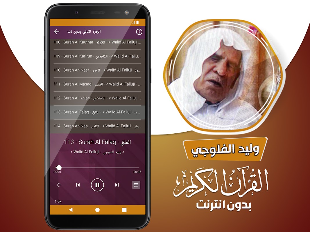 🔹 Holy Quran 응용 프로그램에는 인터넷없이 Quran surahs를 듣고 독자 Walid Al-Falluji의 음성이 포함되어 있으며 Quran을 무료로 암송하는이 응용 프로그램이 특징입니다.