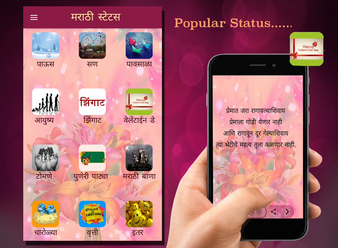 마라타어 상태 (मराठी स्टेटस) 응용 프로그램 마라 티어의 상태 또는 메시지의 큰 모음입니다.