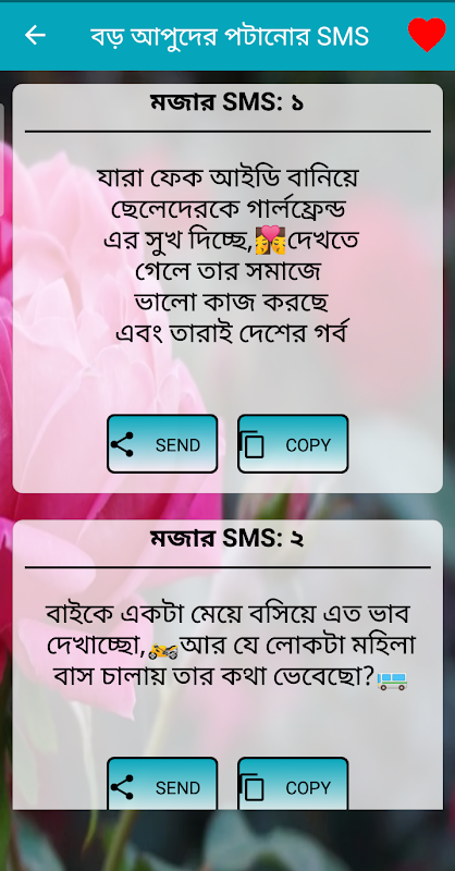 এই অ্যাপসটিতে যে সব অনলাইনে প্রেম করার এস.এম.এস আছে তা অপনি বন্দুদের সাথে ১ কিল্কে কপি এবং শেয়ার করতে পারবেন ।