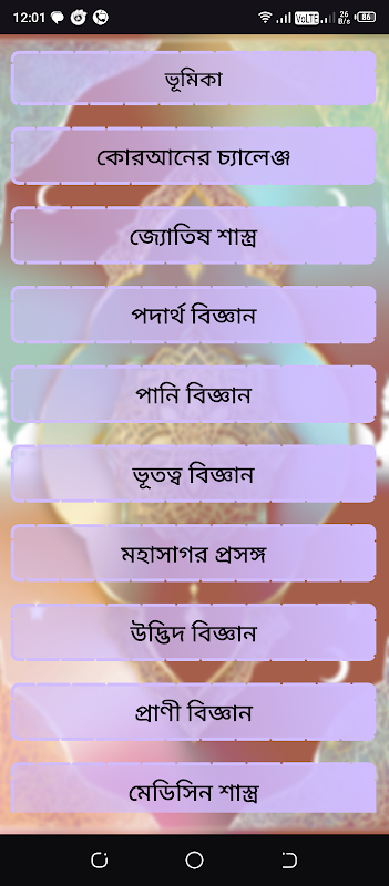 꾸란 및 지식 응용 프로그램 내에서 점성술, 물리학, 물, 지질학, 해양, 식물, 동물, 의학, 생리학, 일반 과학 등이 장별로 논의됩니다.