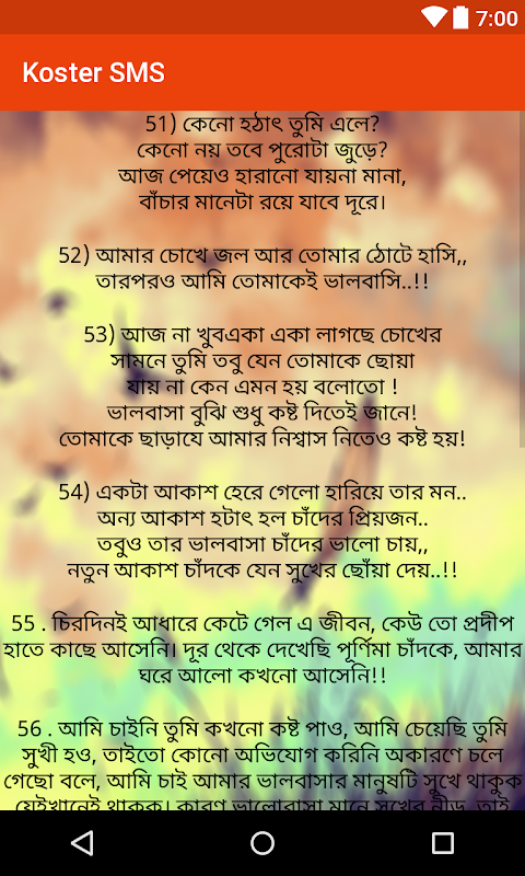 আমাদের এই অ্যাপ এ এমন কিছু কষ্টের এসএমএস দিয়া হয়েছে যা আপনার চোখে পানি নিয়ে আসবে। ভালোবাসার মানুষকে হারানোর কষ্ট কেবল সেই বুঝে যে ভালোবাসার মানুষকে হারিয়েছে। ভালোবাসার কষ্টের এসএমএস আপনি এই অ্যাপ এ পাবেন। মনের মানুষ হারানোর কষ্টের সকল এসএমএস ও এই অ্যাপ এ যোগ করা হয়েছে যা আপনার মনের কষ্ট প্রকাস করবে মনের গভীর থেকে।