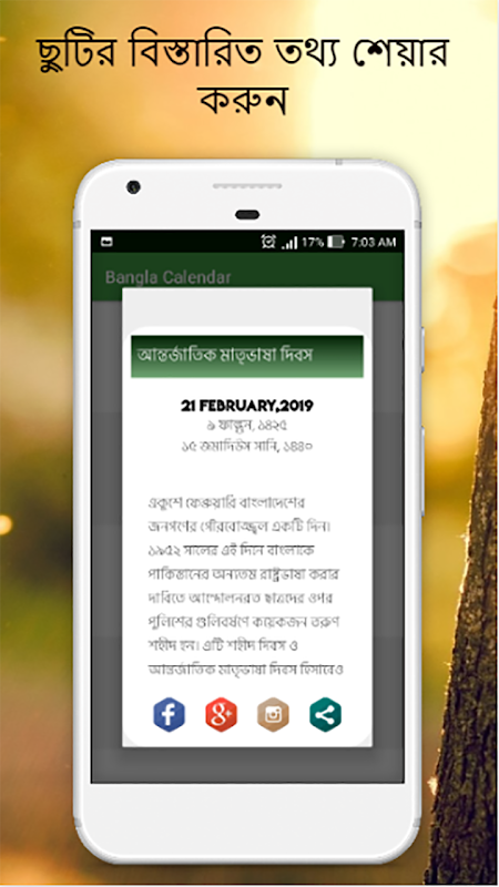 Bangla Calendar Lifetime (Bangladesh) is very much essential application for your daily necessity. Bengali Calendar is very easy to use and you will get Bangla, english and Arabic dates very easily. You can also share currents dates in social media and with your friends.