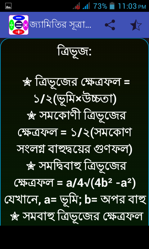 গনিত সবার কাছেই খুব কঠিন মনে হয়. কিন্তু গনিতের সূত্রাবলী জানা থাকলে গণিতের মজা আপনি নিজেই বুঝতে পারবেন. এমনই কিছু বীজ গনিতের সুত্র, পাটি গণিতের সূত্র ও জ্যামিতির সুত্র দিয়ে সাজানো আমাদের অ্যাপলিকেশন টি. অ্যাপলিকেশন টিতে আরও পাবেন