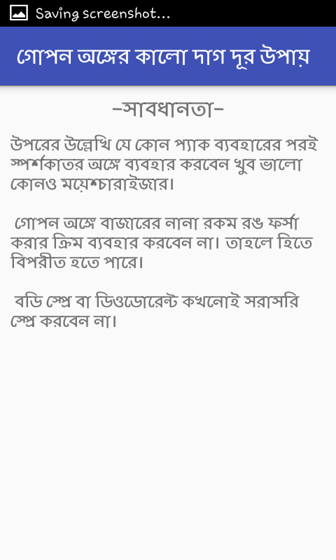 অনেকের গোপন অঙ্গে কালো বিশ্রী দাগ দেখা দেয় । যা কিনা অপ্রীতিকর এবং বিরক্তীকর একটি ব্যপার । সঙ্গীনীর কাছে গেলে হয়ত লজ্জা পেতে হয় এই দাগের জন্য । এই দাগ কিভাবে সহজে দূর করবেন সেই টিপ্স নিয়েই আমাদের এই এপ্স ।