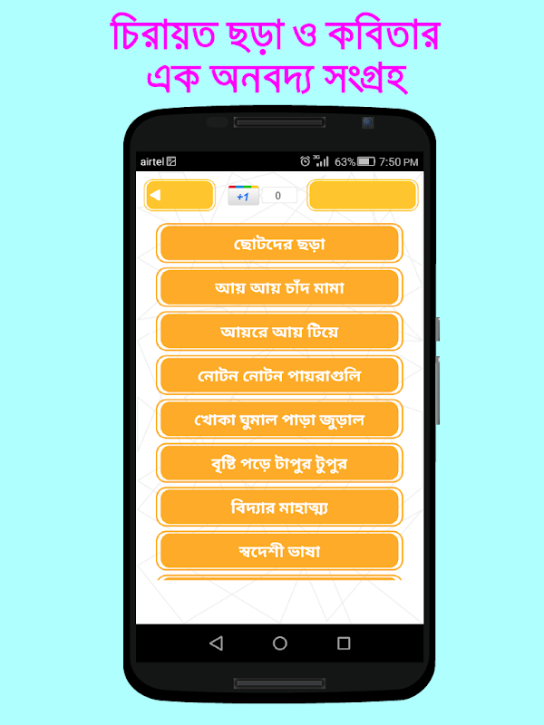 It is hard to find a person who in his/her childhood never read a poem or poetry (bangla chora or kobita). In fact, in our early school life we always had books like sonamonider chora, chotoder chora, chora gaan, kobita somogro, rhymes for baby/kids etc. and most of the cases this type of poetry books always be the favourite one for us. Our love for rhymes or poem pushed some of us to poetry writing. Sometimes we want to teach our children rhymes. In this app we accumulated hundreds of rhymes for kids and babies in bangla. Also we gathered many everliving and everloving poems in bengali.