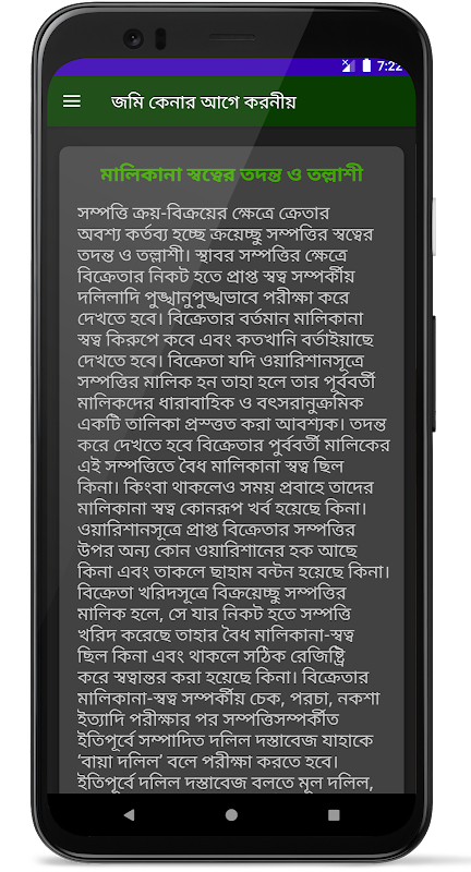 জমি কেনার সিদ্ধান্ত নিয়েছেন? ভাবছেন খুব ভালো জমি। দরদামও আয়ত্তের মধ্যে। জমি কেনার দলিল সম্পাদন করে নিলেই হলো। জমির মালিক হয়ে যাবেন। কিন্তু তড়িঘড়ি করে কিনতে গিয়ে বিপদেও পড়তে পারেন। আমাদের অ্যাপ এর মাধ্যমে আপনি জানতে পারবেন জমি কেনার আগে কি কি করতে হয়, কতো ধরণের দলিল আছে, জমি রেজিস্ট্রেশন আইন, নামজারি, ওয়ারিশ, ভূমি পরিমান পদ্ধতিসহ জমি জমা বিষয়ক যাবতীয় খুঁটিনাটি, আশা করছি আমাদের অ্যাপ আপনাকে জমি কেনার ব্যাপারে সব ধরণের সহায়তা করবে।