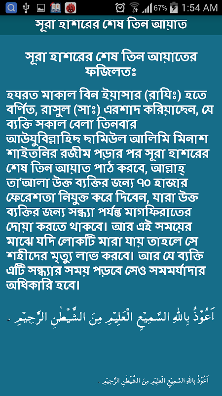 হযরত মাকাল বিন ইয়াসার (রাযিঃ) হতে বর্ণিত, রাসুল (সাঃ) এরশাদ করিয়াছেন, যে ব্যক্তি সকাল বেলা তিনবার আউযুবিল্লাহিছ ছামিউল আলিমি মিনাশ শাইতনির রজীম পড়ার পর সূরা হাশরের শেষ তিন আয়াত পাঠ করবে, আল্লাহ্ তা'আলা উক্ত ব্যক্তির জন্য ৭০ হাজার ফেরেশতা নিযুক্ত করে দিবেন, যারা উক্ত ব্যক্তির জন্য সন্ধ্যা পর্যন্ত মাগফিরাতের দোয়া করতে থাকবে। আর এই সময়ের মাঝে যদি লোকটি মারা যায় তাহলে সে শহীদের মৃত্যু লাভ করবে। আর যে ব্যক্তি এটি সন্ধ্যার সময় পড়বে সেও সমমর্যাদার অধিকারি হবে।