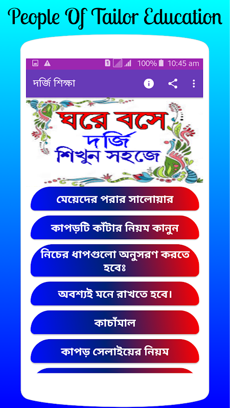 আমাদের এই অ্যাপ থেকে সহজে আপনি দর্জি শিক্ষা সম্পর্কে জানতে পারবেন।এবং ঘরে বসেই আমাদের অ্যাপ থেকে দর্জি কাজ শিখে জিবিকা নির্বাহ করতে পারবেন।