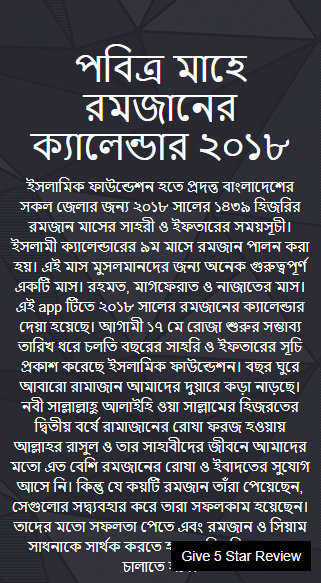 ইসলামী ক্যালেন্ডারের ৯ম মাসে রমজান পালন করা হয়। এই মাস মুসলমানদের জন্য অনেক গুরুত্বপূর্ণ একটি মাস। রহমত, মাগফেরাত ও নাজাতের মাস। এই app টিতে ২০১৮ সালের রমজানের ক্যালেন্ডার দেয়া হয়েছে।
