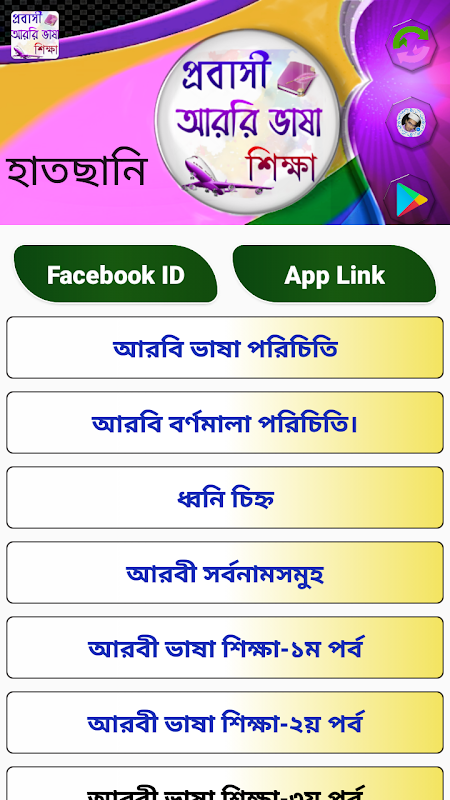 আরবি শিক্ষা arbi shikha বা আরবী ভাষা শিক্ষা learn arabic in bangla আমাদের জন্য অনেক জরুরি যা আমাদেরকে ইসলাম সম্পর্কে এবং কোরআন শিক্ষা Learn Quran সঠিকভাবে জানতে ও বুঝতে সাহায্য করবে। আরবি ভাষা শিক্ষা arbi vasha shikkha এর জন্য আরবি শিক্ষার বই, বাংলা আরবি ভাষা শিক্ষা বই, বাংলায় আরবি ভাষা শিক্ষা ~ Bangla Arbi Sikkha বা আরবি শিক্ষা অডিও অনেক কার্যকারী। আরবী ভাষা শিক্ষা Learn arabic in bnagla বা আরবি শিক্ষা বাংলা সহজভাবে শিখতে বাংলায় আরবি ভাষা শিক্ষা এর জন্য এই বাংলা এপস আরবি ভাষা শিক্ষার বই বাংলা বিশেষ কার্যকারী হবে।