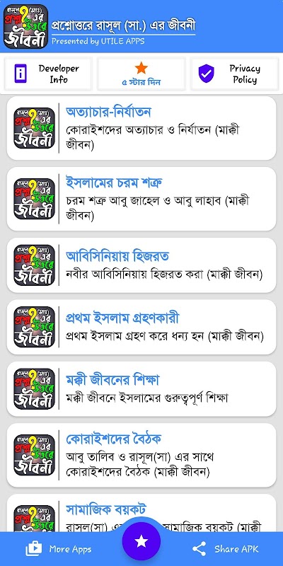প্রশ্নোত্তরে রাসূল সাঃ এর জীবনী অ্যাপটি ভিন্ন ধারায় তৈরিকরা হয়েছে, তাই আশাকরি আপনাদের সকলের ব্যাক্তিগত জীবনে এবং ধর্মীয় জীবনে আমাদের এই আয়োজন প্রশ্ন-উত্তরে রাসূল সাঃ এর জীবনী অ্যাপটি অনেক কাজে আসবে. ভিন্নভাবে তৈরিকরা রাসূল সাঃ এর জীবনী অ্যাপটি ভালো লাগলে 5 স্টার দিবেন এবং আপনাদের মতামত কমেন্টের মাধ্যমে জানাবেন.