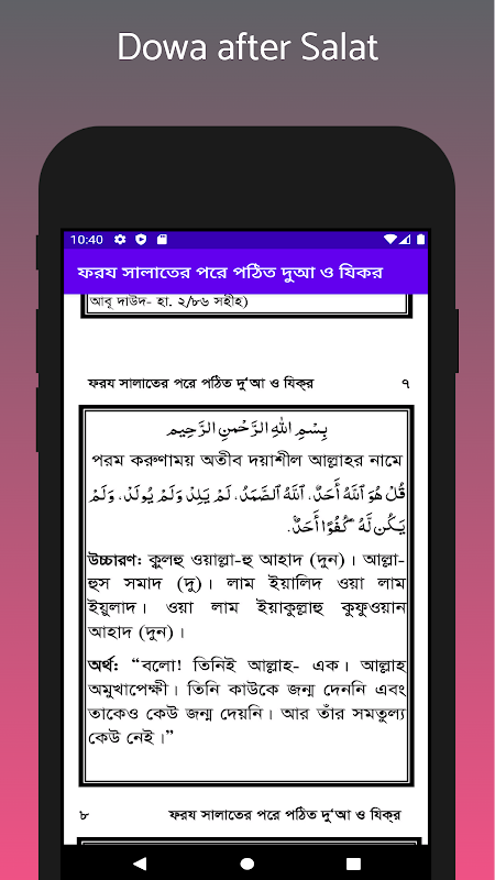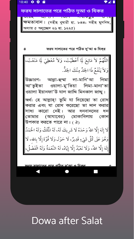 ফরয সালাতের পরের দোয়া ও জিকির বাংলা ইসলামিক অ্যাপ (অ্যাপস) ব্যবহার করে ফরয সালাতের পরের দোয়া, ফরজ নামাজের পর দোয়া ও জিকির আমল করতে পারবেন. ফরজ সালাতের পর দোয়া সমূহ এখানে হাদিস নাম্বার সহ দেয়া আছে. প্রতিদিনের জিকির ও দোয়া, ফরজ নামাজের পর আমল, দোয়া, তাসবিহ, সকাল সন্ধ্যার দোয়া ও জিকির, সকাল সন্ধ্যার আমল, সকাল সন্ধ্যার অজিফা, প্রতিদিনের দোয়া ও আমল, প্রতিদিনের আমল দোয়া ও জিকির এবং নামাজের পর গুরুত্বপূর্ণ দোয়া, নামাজের পর দোয়া ও জিকির আমল করতে পারবেন। ফরয সালাতের পরের দোয়া ও জিকির (ফরয সালাতের পরে পঠিত দু'আ ও যিকর) বাংলা ইসলামিক অ্যাপ (অ্যাপস) টি ব্যবহার করতে পারবেন বিনামূল্যে.