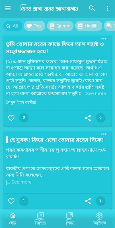 "ফিরে এসো রবের ভালোবাসায়"অ্যাপটিতে কুরআন (꾸란) বাংলা এর এর আয়াত দলিল পেশ হয়েছে. এবং বুখারী শরীফ ও ও শরীফ হাদিস (hadith) ও দলিল হিসেবে দেয়া হয়েছে. অ্যাপ টি সম্পূর্ণ সম্পূর্ণ বাংলা ভাষীদের কথা মাথায় রেখে রেখে বানানো.