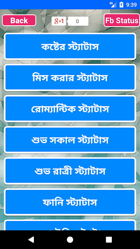 এপটির মাধ্যমে আপনি আপনার পছন্দ মত বাংলা ফেসবুক স্ট্যাটাস ও ইংলিশ ফেসবুক স্ট্যাটাস সংগ্রহ করতে পারবেন খুব সহজে।