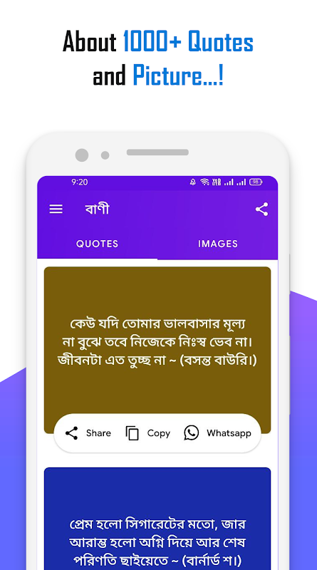 Bangla Bani 앱은 Bangla 인용문, Bangla bani, Bangla ukti를 읽고 Facebook 상태, Whatsapp 상태 등을 통해 친구 및 가족과 공유할 수 있는 놀라운 Android 인용문 앱입니다. 우리는 새로운 벵골어 인용문을 추가했습니다 / Bangla Ukti / Bangla Bani.