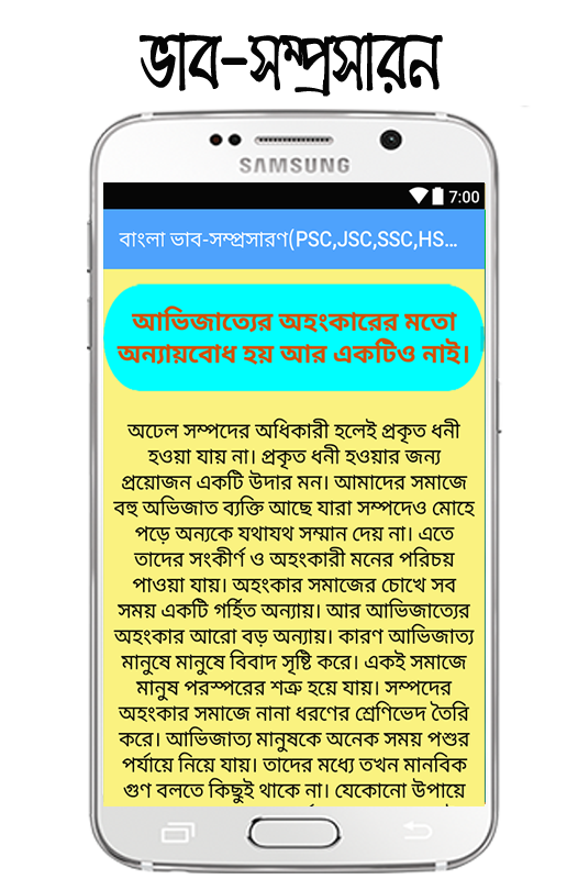 বাংলা ভাব-সম্প্রসারন খুবই প্রয়োজনীয় একটি বিষয়। সকল পাবলিক পরীক্ষায় বাংলা ২য় এর ভাব-সম্প্রসারন আসে। ভাবসম্প্রসারণের মাধ্যমে ছাত্রছাত্রীরা ভাবের গভীরতা বুঝতে সক্ষম হয়। ভাবের গভীরতার সাথে সাথে লেখার মান বৃদ্ধিতেও ভাবসম্প্রসারণ ভূমিকা পালন করে। ভাব-সম্প্রসারন অনেকে খুব সহজে পড়তে পারে। এই জন্য আপনাদের প্রয়জনে আমরা এই অ্যাপটি তৈরি করেছি। আশাকরি সকলের অনেক কাজে দেবে।