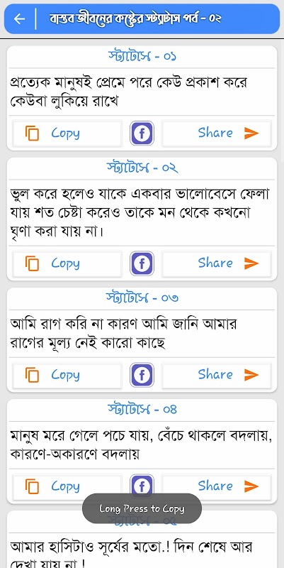 প্রিতিটা মানুষের জীবনেই কষ্ট রয়েছে তবে, বাস্তব জীবনে মানুষ নানা কারণে কষ্ট পায় কিন্তু সব দুঃখ কষ্ট মানুষকে কাদায় আর মানুষ কাঁদে যখন তার আপন কেউ কষ্ট দেয় অথবা বাস্তব জীবনে কষ্ট পেলে. বাংলা কষ্টের স্ট্যাটাস অ্যাপটিতে রয়েছে বেশ কিছু বাস্তব জীবনের কষ্টের স্ট্যাটাস এবং বাস্তব জীবনের কষ্টের এসএমএস. বাস্তবতার সাথে মানিয়ে কষ্টের স্ট্যাটাস এবং বাস্তব জীবনের কষ্টের এসএমএস নিয়ে এই অ্যাপটি তৈরি করা হয়েছে.