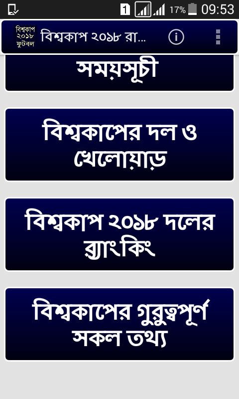 এই অ্যাপটিতে আপনি ২০১৮ ফুটবল বিশ্বকাপ এর সকল তথ্য পাবেন।