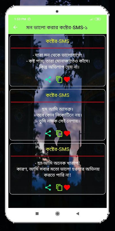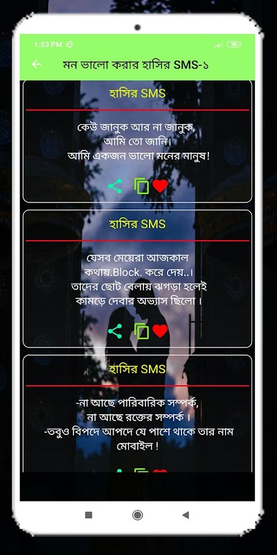 মন ভালো করার- SMS এই অ্যাপসটি থেকে আপনারা ভালোবাসর মানষকে দেয়ার মত সকল ধরনের রোমান্টিক হাসির কষ্টের SMS পাবেন. যা আপনার মনের মানুষটিকে শেয়ার করে মন ভালোকরতে বা সব সম হাসাতেপারেনপারেন মনের কথাগুলো খুব সুন্দর ভাবে প্রকাশ করার জন্য আোদের অ্যাপটবি ব্যটবি ব্যটবহর কিছু আবেগী কষ্টের কথা বলে আরো ভালোবাসা পেতে পারেন।