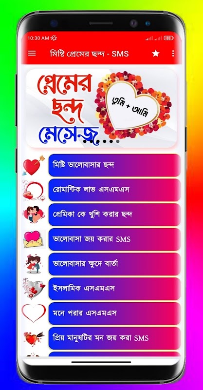 প্রিয় মানুষটিকে খুশি করতে কত কিছুইনা করতে হয় কখনো ভালোবাসার মেসেজ পাঠিয়ে কখনো বা মজার জো ঁকস বলে তাই প্রিয় মানুষটির সাথে এসএমএস এর ভাষ ায় কথা বলুন রোমান্টিকতা আপনাদের মাঝে চলে আসবে ।ভালবাসার মানুষের সাথে কথা হবে ছন্দে,ছন্দে।সম ্পার্ক মধুময় রাখতে তুলে ধরা হয়েছে আধুনিক নিউ ছন্দ 예. ভালোবাসার প্রিয় মানুষটিকে ভালো রাখতে আমাদে র অ্যাপটিতে পাবেন ভালোবাসার এসএমএস,রোমান্টিক এসএমএস,বাংলা হাসির এসএমএস,ইসলামিক এসএমএস, বন্ধ ুত্বের এসএমএস,মরে পড়ার এসএমএস,শুভ রাত্রি এসএম এস
