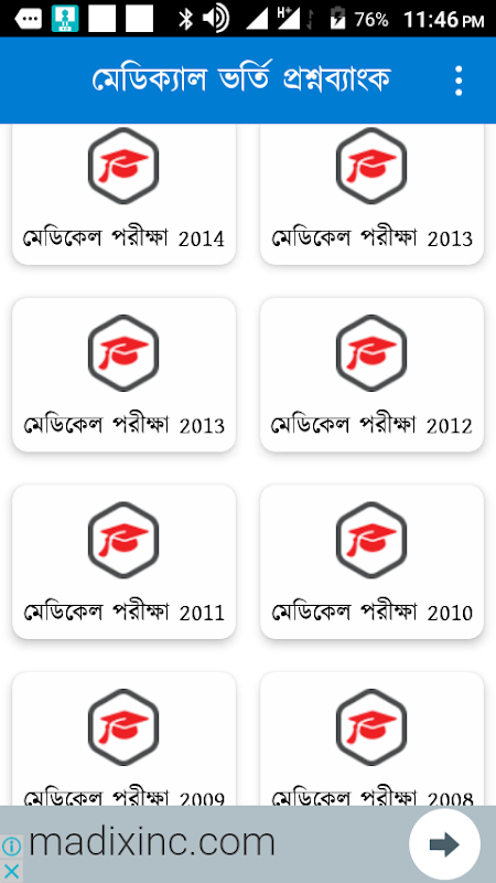 মেডিক্যাল ভর্তি পরীক্ষার বিগত বছরের প্রশ্ন এবং উত্তর নিয়ে এই অ্যাপ বানানো হয়েছে । এই অ্যাপে ৯০০ এর বেশি এমসিকিউ রয়েছে । এই অ্যাপে ৩ টি স্ক্রিন রয়েছে । প্রথম স্ক্রিনে প্রশ্নের সাল উল্লেখ করা হেছে । দ্বিতিয় স্ক্রিনে রয়েছে এমসিকিউ । স্ক্রিন স্লাইড করলে পরবর্তী প্রশ্নে যাওয়া যাবে । ইউজার ইচ্ছা করলে যেকোন প্রশন সিলেক্ট করতে পারবে প্রশ্নের নাম্বার টাইপ করে । তৃতীয় স্ক্রিনে পরীক্ষা দেয়ার ব্যবস্থা রয়েছে ।