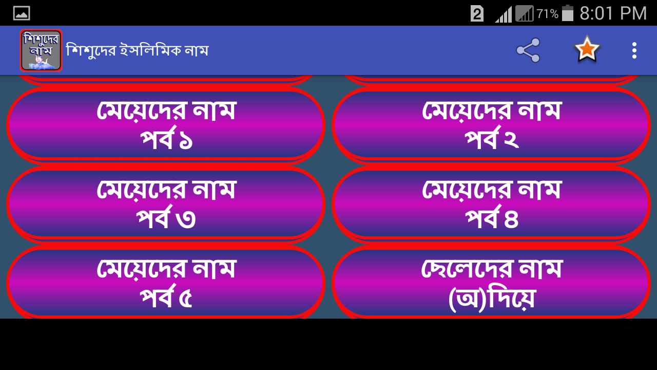 ★ আমরা অ্যাপটিতে ছেলে শিশুর সুন্দর নাম এর ৫ টি পর্বে ভাগ করে দিয়েছি যার প্রত্যেকটির অর্থ সহ পাবেন এবং মেয়ে শিশুর সুন্দর ইসলামিক নাম এর ৫ টি পর্বে ভাগ করে দিয়েছি যার প্রত্যেকটির অর্থ সহ পাবেন।