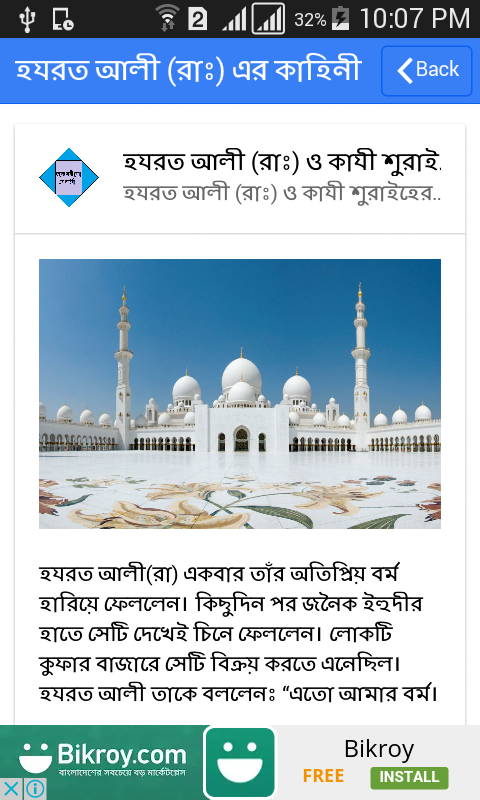 * আলী (রা) পথিককে পাশাপাশি হাঁটতে বাধ্য করলেন - এছাড়াও হযরত আলী (রাঃ) এর জীবনের আরও অনেক কাহিনী নিয়ে এই অ্যাপ সাজানো হয়েছে