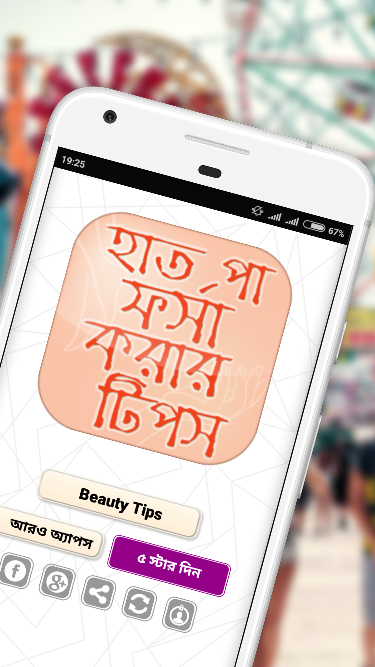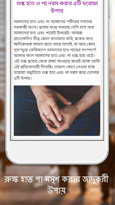 হাত পা ফর্সা করার উপায় - beauty tips in bangla নিয়ে মোটামুটি একটি স্বচ্ছ ধারনা দিতে আমাদের এই ক্ষুদ্র প্রয়াস। আমরা সবাই সৌন্দর্য প্রিয় আর এই সৌন্দর্য ধরে রাখতে বা বাড়াতে কত ধরনের রূপচর্চা -ই না করে থাকি। মেয়েদের রূপচর্চা ও ত্বকের যত্ন- meyeder rupchorcha নিতে তারা পার্লার বা বিউটিসিয়ান দের কাছে ভিড় লেগেই থাকে। কে চায় হাত পা ফর্সা করার উপায় জানতে কেউ বা চায় মুখ ফরসা করতে। অনেকের মুখ ফরসা হলেও শরীর ও হাত পা সুন্দর হয় না, তারা চায় তাদের কাল হাত-পা ফর্সা করার উপায়। তাই মেয়ে ও ছেলেদের ত্বক ফর্সা করার উপায় বা Beauty tips for fair and glowing skin নিয়ে আমাদের হাত পা ফর্সা করার উপায় - beauty tips in bangla অ্যাপে কিছু গুরুত্বপূর্ণ beauty tips in bangla নিয়ে আলোচনা করা হয়েছে। আমাদের এই অ্যাপটিতে আপনারা পাবেন